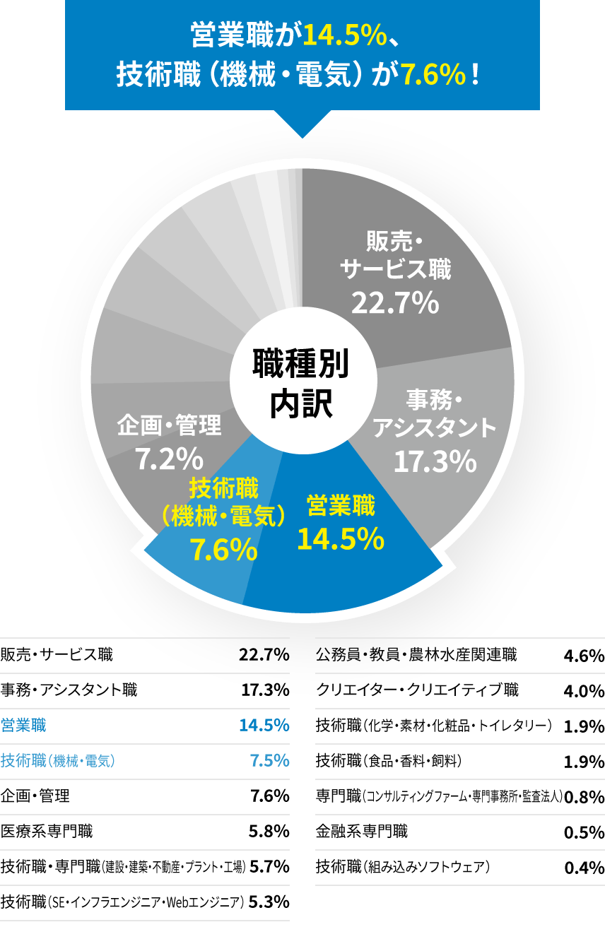 職種別では、採用ニーズの高い営業職やエンジニアの割合が多め。